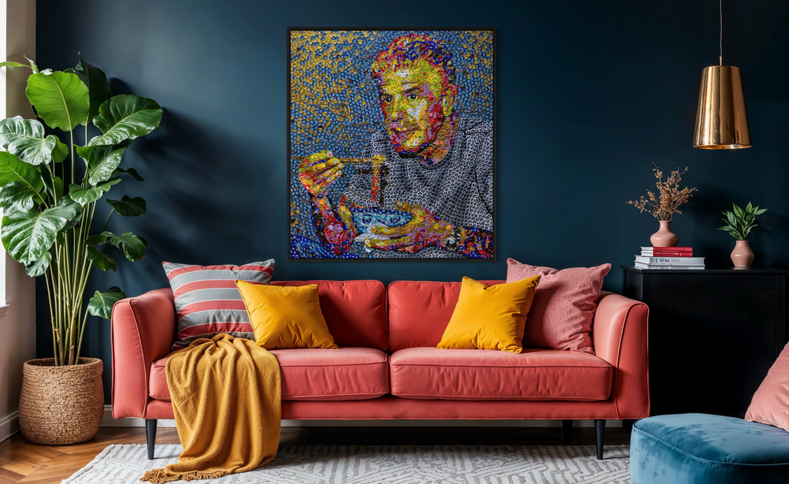 A 54" x 48" bottle cap mosaic of Anthony Bourdain in Hanoi, captured mid-slurp over a humble bowl of noodles. Vibrant blues, yellows, reds and more shimmer together, celebrating curiosity, humanity, and the beauty of shared meals across cultures.