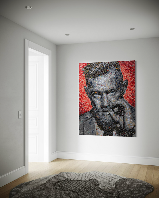 A striking 54" x 42" mosaic of Conor McGregor, crafted from repurposed bottle caps, captures his fierce persona in bold black, white, grey, and red. The design showcases his intense gaze with the red adding dynamic energy, and the textured caps giving a rugged, edgy feel to his powerful image.