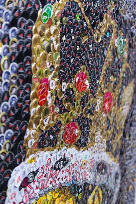 This stunning 42" x 54" Freddie Mercury bottle cap mosaic is the perfect way to honor the late lead singer of the legendary band Queen. Created with 4,366 used bottle caps, this piece is sure to be a conversation starter. Many of the caps have been chosen to symbolize pieces of Freddie's life and Queen's iconic songs, allowing you to keep a piece of their legacy in your home. This unique piece of art is the perfect way to pay tribute to a true music legend.