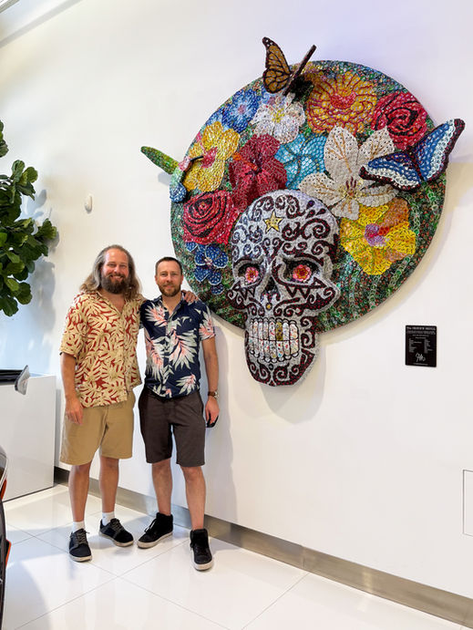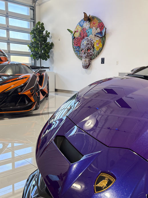A 72-inch bottle cap mosaic reimagines entrepeneur Barry Skolnick’s Ikonick Motors logo—its bold skull framed by vibrant flowers, with 3D butterflies and a hummingbird flying out from the piece. This mosaic blends grit and elegance, proudly displayed among his private art and automotive collection in Miami, Florida.