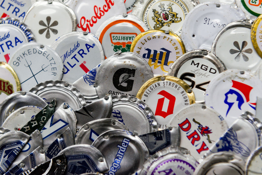 A 42" x 60" bottle cap mosaic captures Jerry Garcia in striking greyscale, gazing over his glasses with chin dipped in quiet reflection. Subtle shifts in metallic tones bring depth and soul to the portrait, honouring the timeless spirit of the Grateful Dead icon.