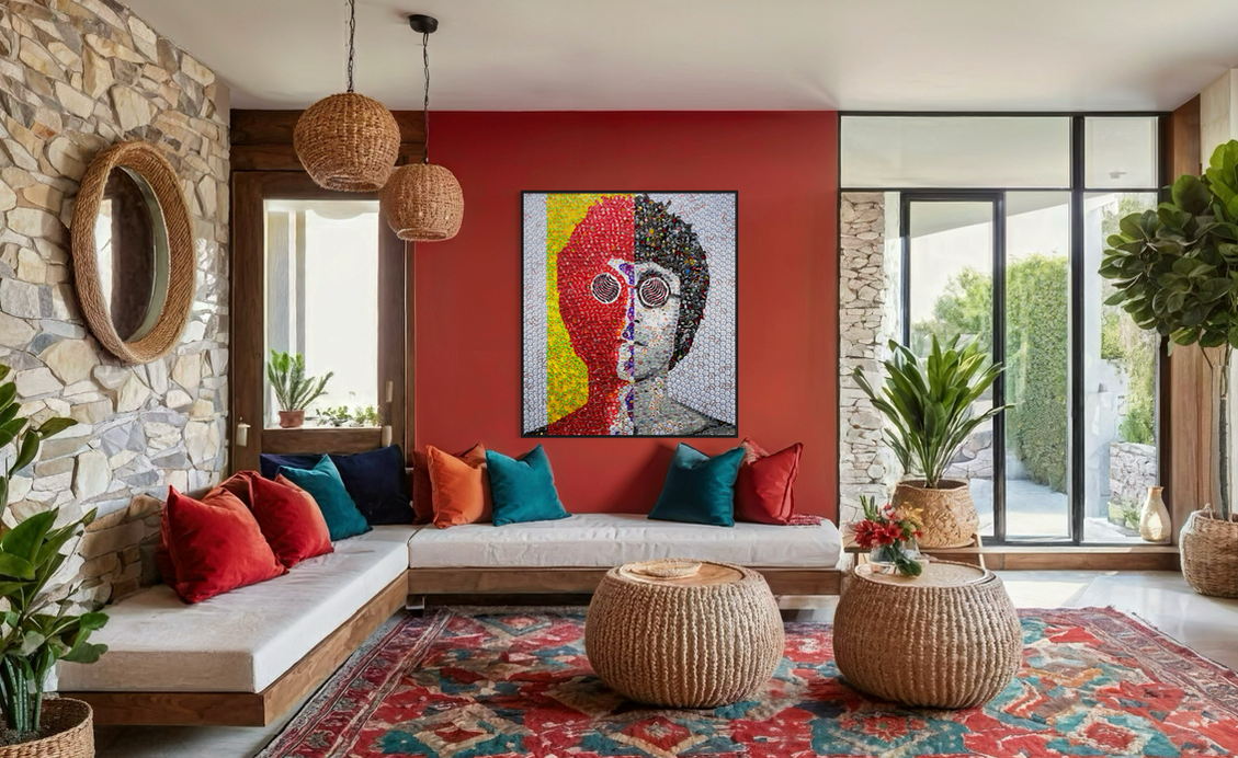 A 48" x 42" psychedelic mosaic of John Lennon, crafted from repurposed beer bottle caps, bursting with vibrant colours and swirling patterns that echo his iconic style, spirit, and message of peace