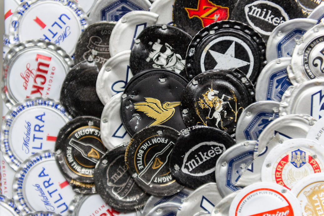 A 48" x 42" greyscale portrait of Larry David, meticulously crafted from used beer bottle caps. Subtle tones of silver, black, white, and muted greys capture his deadpan expression with striking depth and texture, turning discarded caps into a sharp, minimalist tribute to comedic genius.
