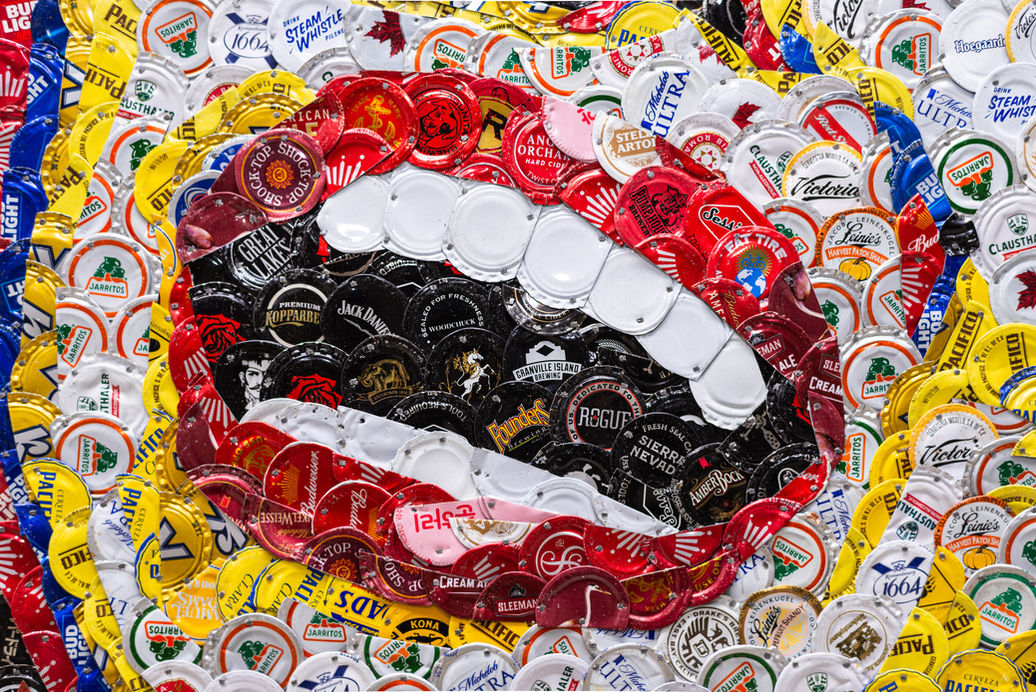 A stunning mosaic of Marilyn Monroe, crafted from repurposed beer bottle caps, captivates her iconic allure. The radiant beauty is framed by vibrant roses, her favourite flower, symbolizing grace and passion. Each shimmering cap intricately weaves a colorful tapestry, immortalizing Monroe's timeless charm amidst a bed of blooming nostalgia.